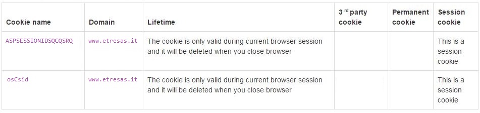 Il cookie ASPSESSIONIDSQCQTSRQ è un cookie tecnico e al suo interno viene salvato un valore alfanumerico che identifica la sessione dell'utente. Questo cookie viene eliminato dopo la chiusura del browser e al suo interno non viene memorizzata nessuna informazione personale.